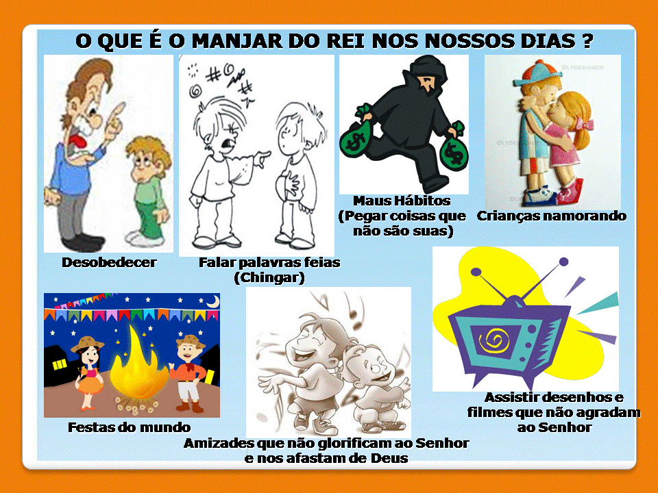 No slide 2 coloquei alguns exemplos de algumas coisas nos nossos dias é manjar que o adversário nos aferece, gostaria de frizar a parte em que devemos falar sobre maus hábitos, naõ é bom usar a palavra ladrão e nem roubo para as crianças, acho que devemos explicar de uma forma mais simples dando um exemplo apenas de que não devemos pegar o que não nos pertence. Outra situação é o namoro...eu coloquei esse exemplo porque essa semana fiquei surpresa, sou professora de pequenos e duas mães me procuraram dizendo que era bom que na aulinha fosse ensinado que nessa idade não se deve namorar pois ainda não está no tempo, pois seus filhos uma de 6 anos e outro de 4 anos já estavam falando em namorar, e as vezes pensamos..ah isso é bobeira de criança, mas irmãs devemos ficar atentos aos filhos pois nos dias de hoje a opressão sobre as crianças tem aumentado e não devemos nos distrair com essas coisas pensando que não tem nada a ver, podemos perder nossos filhos para o mundo por causa de coisas assim. Na figura que tem dois meninos dançando eu coloquei para exemplificar amizades que nos afastam de Deus, é bom nessa figura explicar que não estamos proibidos de ter amigos, mas temos que ver bem com quem andamos para não fazermos coisas que nos afastam de Deus.