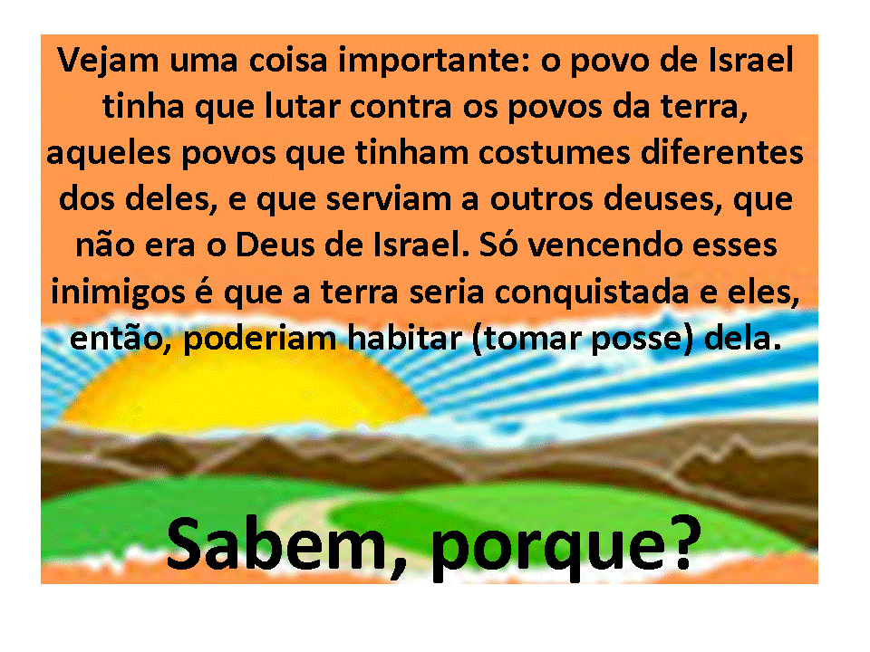 Vejam uma coisa importante: o povo de Israel tinha que pelejar (lutar) contra os povos da terra, aqueles povos que tinham costumes diferentes dos deles, e que serviam a outros deuses, que não era o Deus de Israel. Só vencendo esses inimigos é que a terra seria conquistada e eles, então, poderiam habitar (tomar posse) dela.